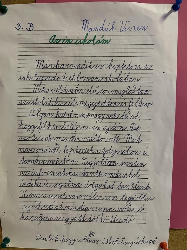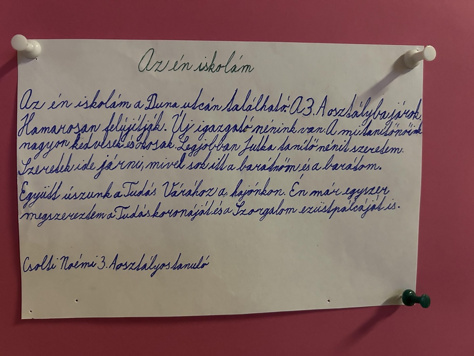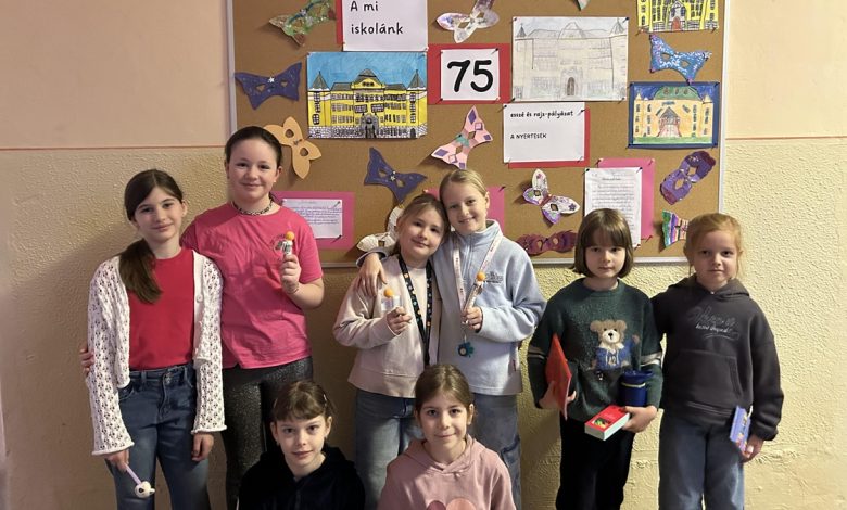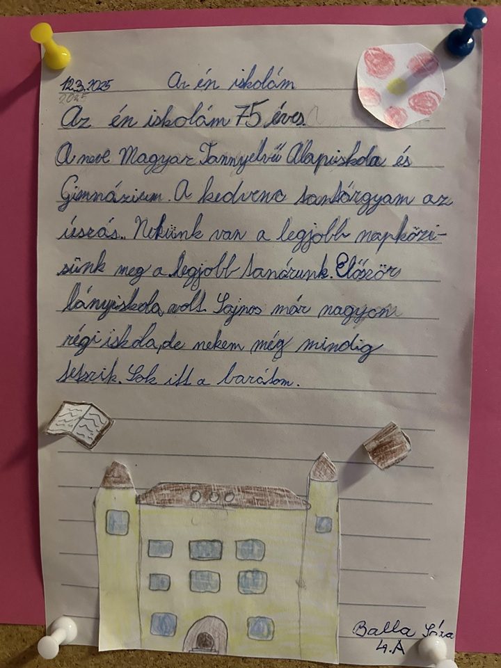Az esszépályázaton majdnem minden harmadik és negyedik osztályos tanulónk részt vett. Írásaikban megjelentek kedvenc tanító nénik és bácsik, izgalmas kirándulások, felejthetetlen osztályélmények, és persze az a bizonyos „csengő előtti utolsó perc“ is. A gyerekek humorral, őszinteséggel és meglepő érettséggel fogalmazták meg, mit is jelent számukra az iskola. A zsűri itt is a legötletesebb, legszellemesebb, legszívhezszólóbb munkákat díjazta. A pályázatok bebizonyították, hogy iskolánk nem csupán egy épület, hanem élmények, barátságok és közös emlékek színtere. A 75 év története tovább íródik diákjaink rajzaiban és gondolataiban – színesen, vidáman, szeretettel.