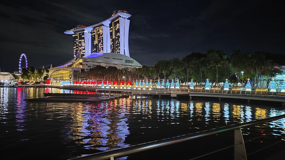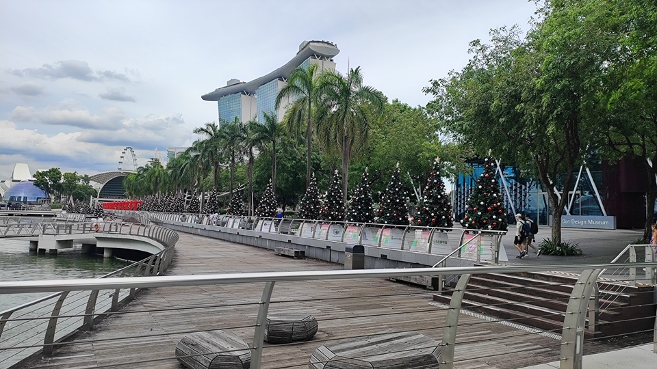 A Marina-öböl partján már javában készültek a karácsonyi díszítések. Különös élmény volt a karácsonyfákat és fényeket tűző napsütésben látni, valahogy nehezen tudtuk összeegyeztetni a karácsonyi hangulatot a nyári meleggel. Megtaláltuk a verseny helyszínét is, amely a Marina Bay Sands bevásárlóközpont konferenciaközpontjában kapott helyet. Bár a termeket már előkészítették, mi csak kívülről csodálhattuk meg, mert egy őr határozottan megállított bennünket.