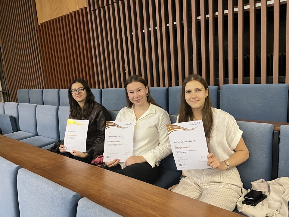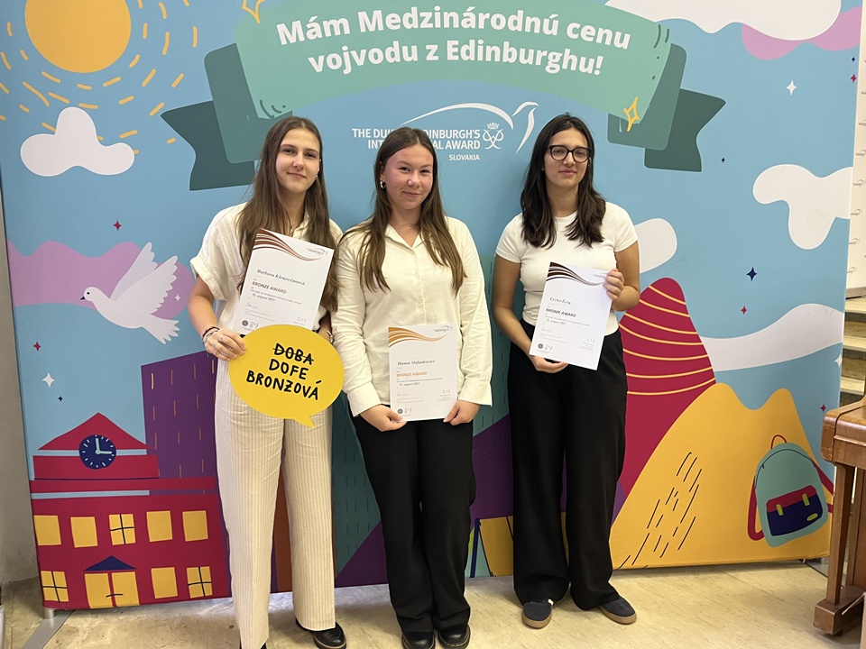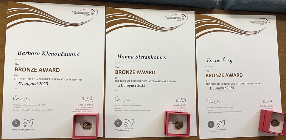 Idén szeptember 25-én különleges pillanatnak lehettünk tanúi: három harmadikos diákunk – Écsy Eszter, Stefankovics Hanna és Klenovčanová Barbora – ünnepélyes keretek között vehette át a bronz fokozatot igazoló elismerő oklevelet a Comenius Egyetem Pedagógiai Karának aulájában. A lányok nemcsak teljesítették a kihívást, hanem máris új célokat tűztek ki: az ezüst fokozat elérése felé tartanak!