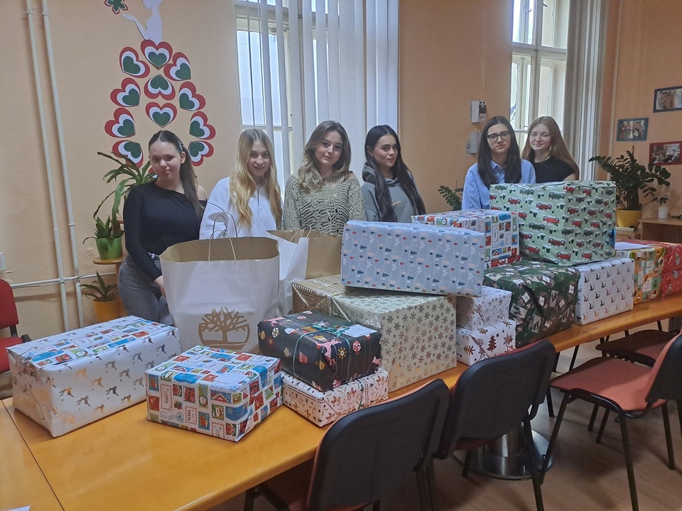 „Ajándékot kapni jó, de adni, látván a szemekben felcsillanó örömöt, még jobb” – ezt a mottót követve gimnazista osztályaink lázas “dobozolásba” kezdtek. Megható volt látni, ahogy a jókai Jó Pásztor Háza Gyermekotthon lakói számára gyűltek az ajándékok, teltek meg, sőt, “túlcsordultak” a cipősdobozok, annyi mindent hoztak diákok és tanárok egyaránt. Minden csomagba került egy-egy kézzel írt üzenet is, pár kedves szó, egy darabka a szívünkből. És bár nem láthatjuk a 22 gyerkőc arcát, amikor a karácsonyfa alatt keresgélve kinyitják a nekik szánt csomagot, az ajándékokat személyesen szállítottuk el és helyeztük ama bizonyos fa alá. Az ajándékok szánját Csémi Máté István, IV.B osztályos DÖK-tagunk vezette, segítőként pedig mellé szegődtünk iskolánk igazgatónőjével, Prékop Máriával, Kulcsár Mónika igazgatóhelyettessel és nem utolsósorban Tepea Heiva Victoriával, diákönkormányzatunk elnökével, valamint Heiva édesanyjával. Az adakozásnak ezzel azonban még messze nem volt vége, a DÖK csapata ugyanis az “egy doboznyi mosoly” jótékonysági akción kívül még egy gyűjtést is megszervezett, az ebből befolyt pénzösszeggel pedig Ádámkának szereztek örömet diákönkormányzatunk angyalkái.