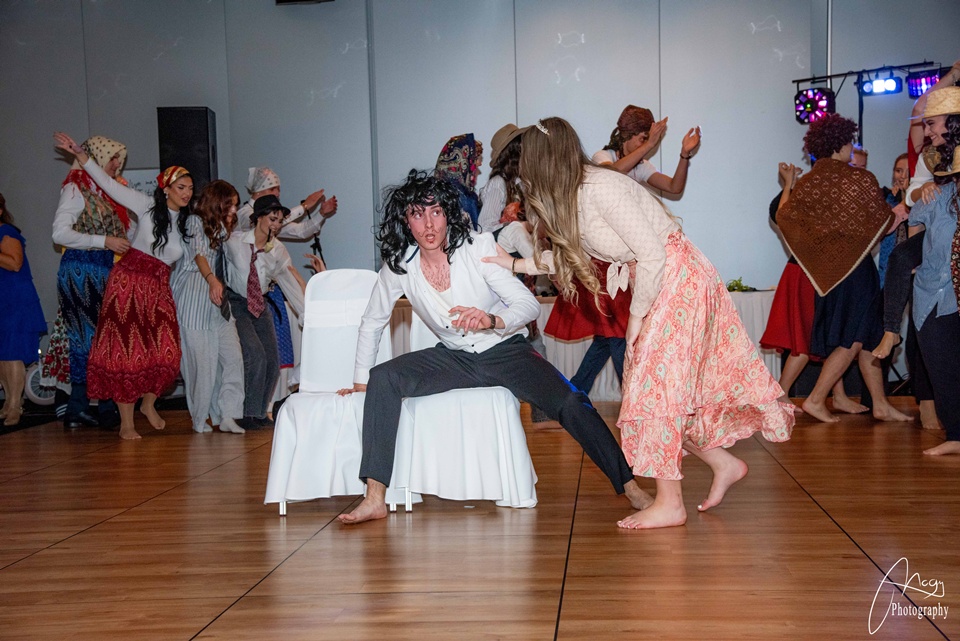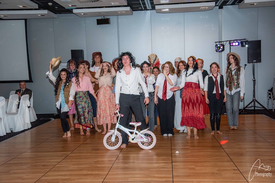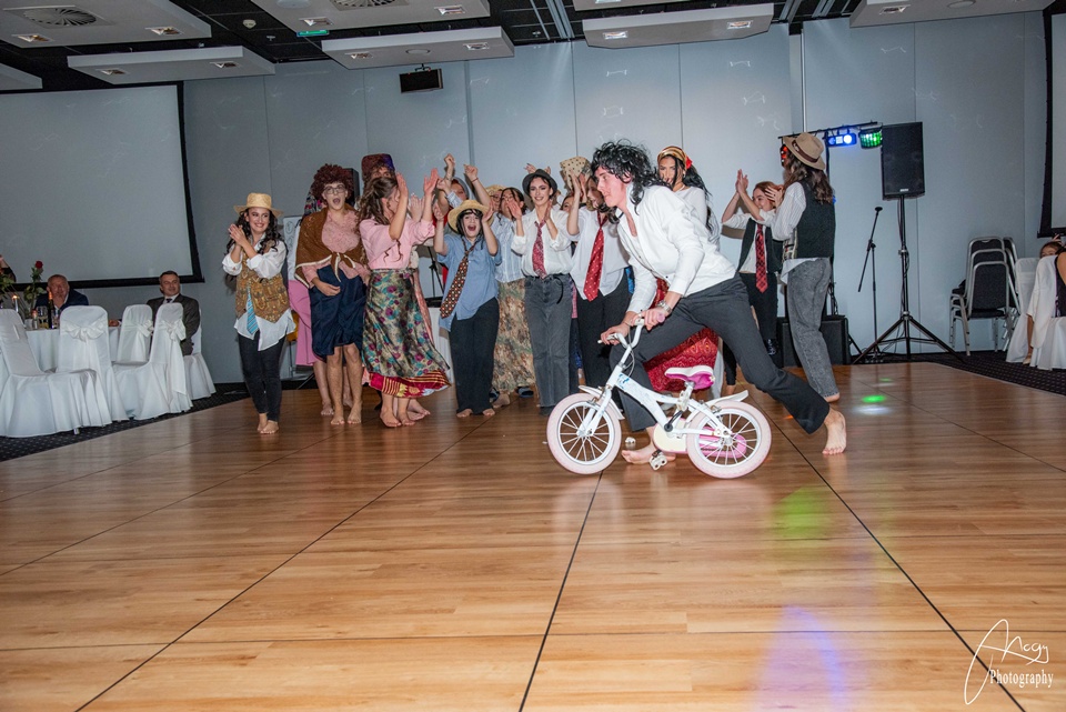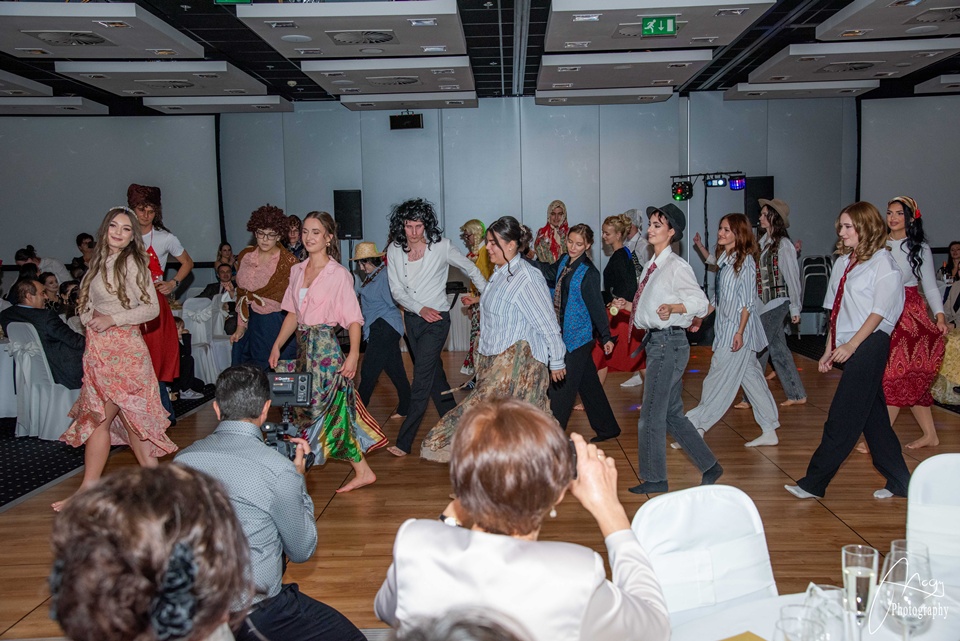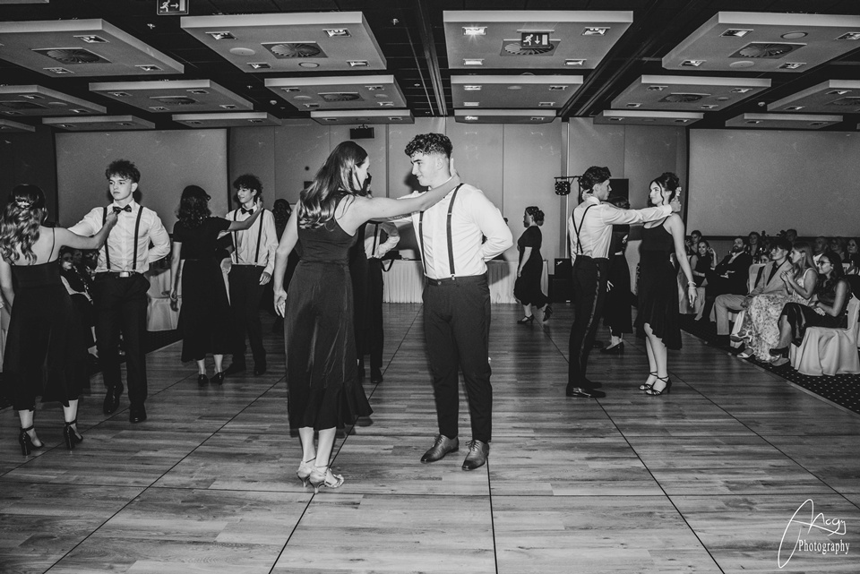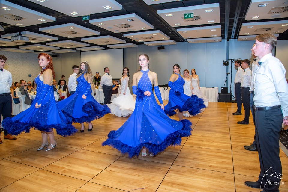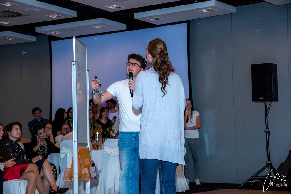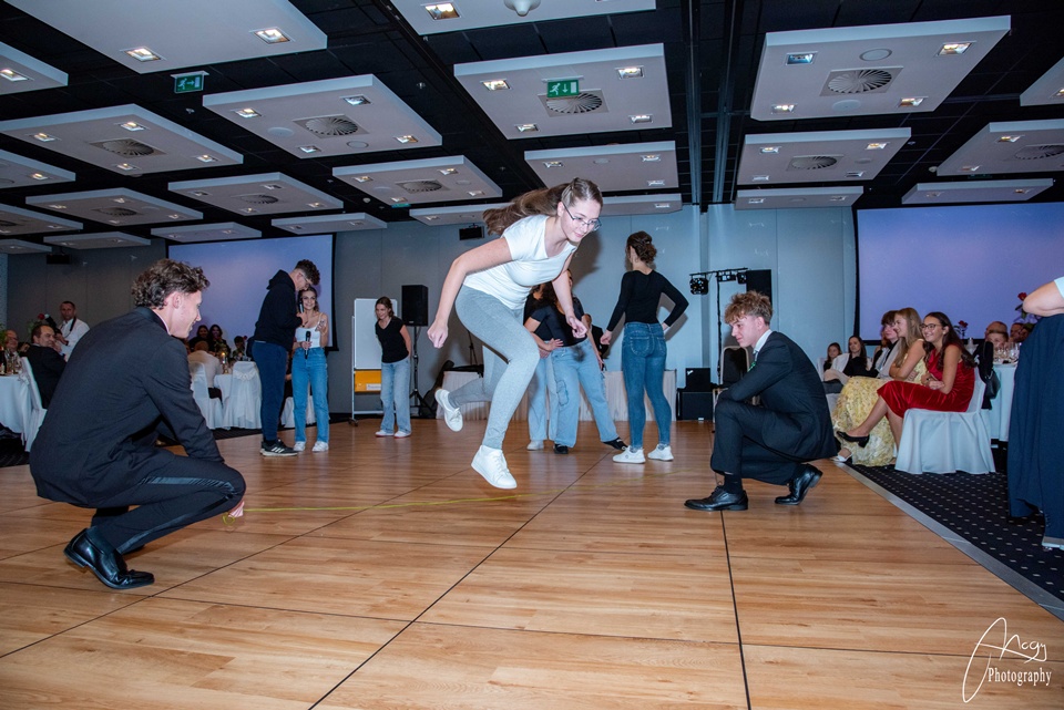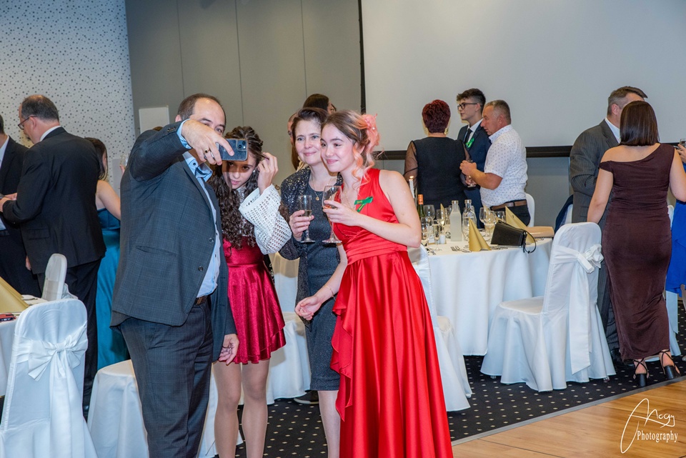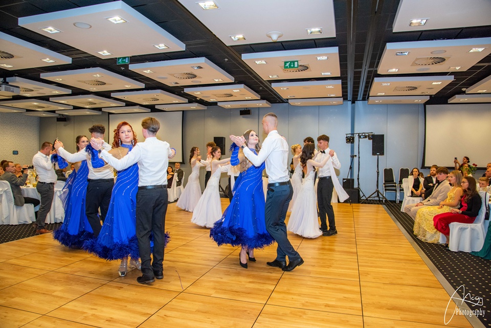Október 25-én, szombaton kora délutántól kezdve készülődtünk a Gate One hotelben, néhány órával később pedig már a kiválasztott zenére vonultunk be a tanárokkal és családtagokkal megtelt terem közepére. Meghallgattuk az igazgatónő és az osztályfőnökök beszédét, majd jöhetett a szalagtűzés és a koccintás. Sor került a szülői táncra, amit a finom vacsora, a keringő és osztályműsorok követtek. Mi, B-sek tanórai jeleneteket adtunk elő az elmúlt évekből – továbbá egy tangós fellépésünk is volt –, az A-sok pedig táncos-zenés produkcióval készültek. Az este meghatározó pontja volt az osztályok készítette videók megtekintése: meghatottan, keserédes nosztalgiával telve néztük a kiskori képeket és közös emlékeinket. Éjfélkor megérkezett a torta, utána pedig kezdetét vehette a bulizás és a mulatozás hajnalig.
