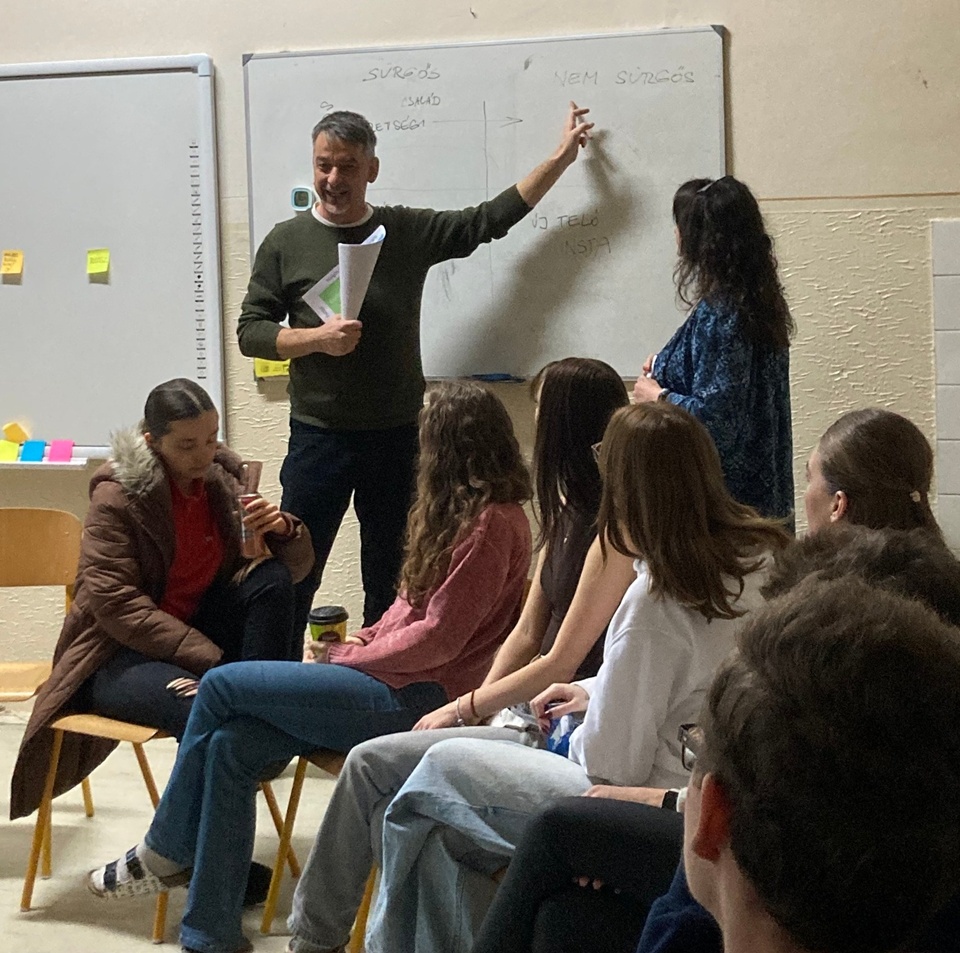A délelőtt első részében Fehér Krisztina és Takács Attila tartott interaktív előadást az időbeosztás és a hatékony tanulásszervezés témájában. A diákok megtanulhatták, hogyan osszák be idejüket a vizsgákra való felkészülés során, és milyen módszerekkel alakíthatnak ki olyan tanulási stratégiákat, amelyek segítik őket a stressz csökkentésében és a teljesítmény növelésében. Ezt követően Kulcsár Mónika pályaválasztási tanácsadó mutatta be az egyetemi jelentkezés folyamatát, a felvételi lépések részleteit, a határidőket és a szükséges dokumentumokat. A foglalkozás során szó esett a szakválasztás szempontjairól, valamint a külföldi intézményekben való továbbtanulási lehetőségekről, így a diákok gyakorlati tanácsokat kaptak a sikeres jelentkezéshez.